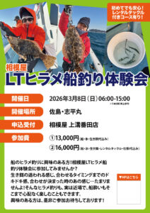 NEWイベント告知2026年3月8日(日)相模屋LTヒラメ船釣り体験会イベント概要 開催日 2026年3月8日(日) 開催時間 6:00-15:00(14:00沖上がり) 開催場所 佐島 志平丸 参加費 ①13,000円(船代・氷・生き