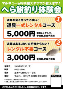 NEWイベント告知2026年5月23日(土)2026年相模屋へら鮒釣り体験会イベント概要 開催日 2026年5月23日(土) 開催時間 06:30〜15:00 開催場所 厚木ヘラブナセンター小池 参加費 道具をお持ちでない方¥5000
