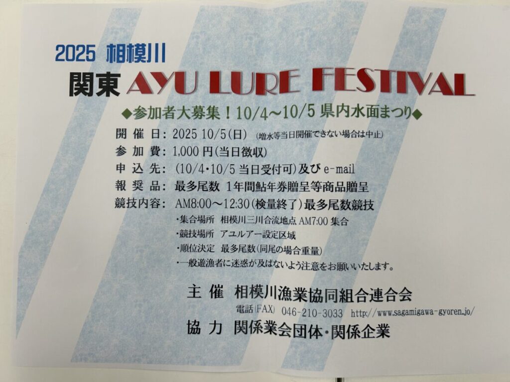 コーナー情報2025年9月12日2025相模川 関東AYU LURE FESTIVAL スタッフ平賀 0分14秒保存する共有: 2025年10月5日(日)に2025相模川 関東AYU LURE FESTIVALが開催されます。当日参加も大丈夫のようですのでご都合が合えば是非参加してみては如何でしょうか?! 関連コーナー: アユコーナー