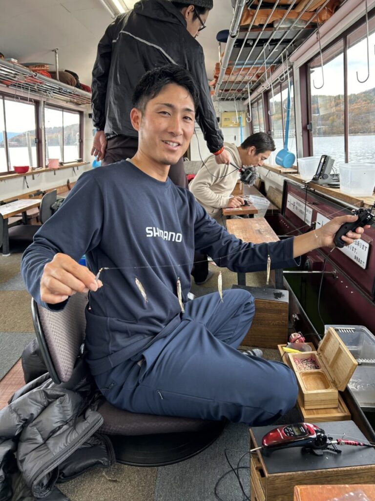 なぎさは1人の幅が比較的広めに出来てます。シマノわかさぎテスターをやっている船頭さんもいて、釣り方なども教えてくれます。雰囲気も良い船宿さんです♪
