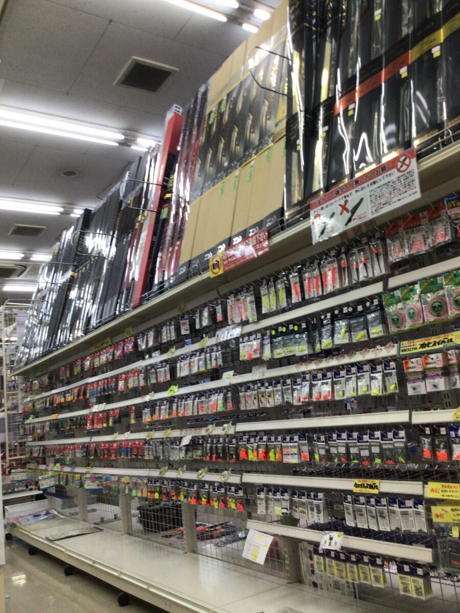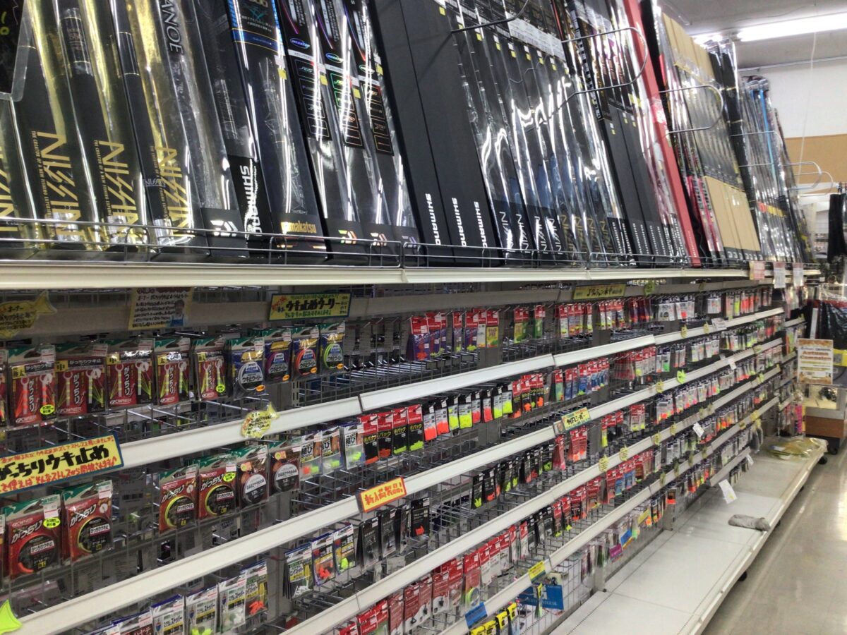 以前は高い位置まで陳列していたウキ止めやストッパー、シモリ玉等を全て磯竿の下に陳列することによって、より商品を手に取りやすくなり、高い位置の商品が無くなったので踏み台や脚立を使って取る必要もなくなりました♪