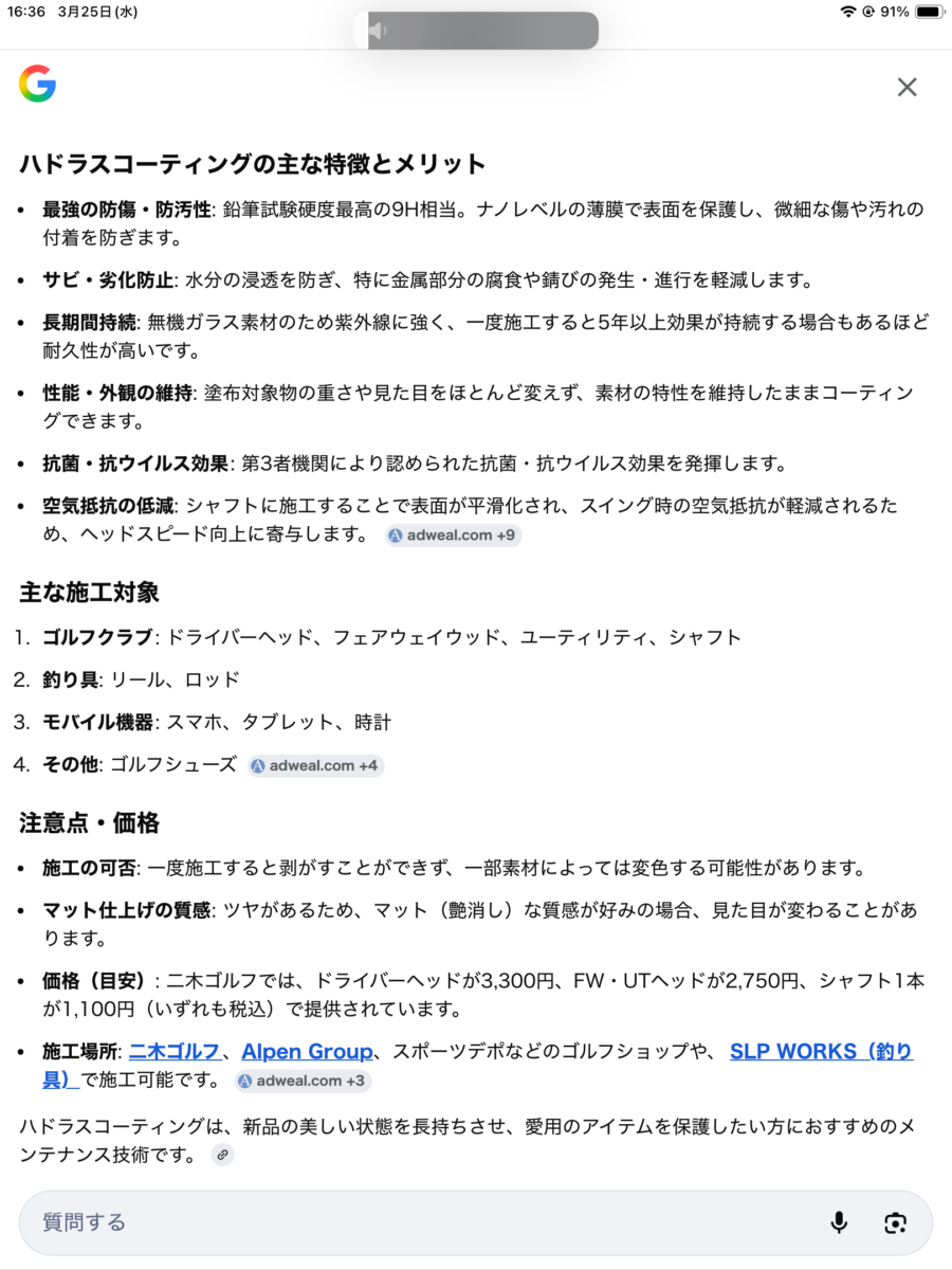 ハドラスガラスコーティングの効果についてググってみたら良い事ずくめだったので、スクリーンショットを貼っておきます