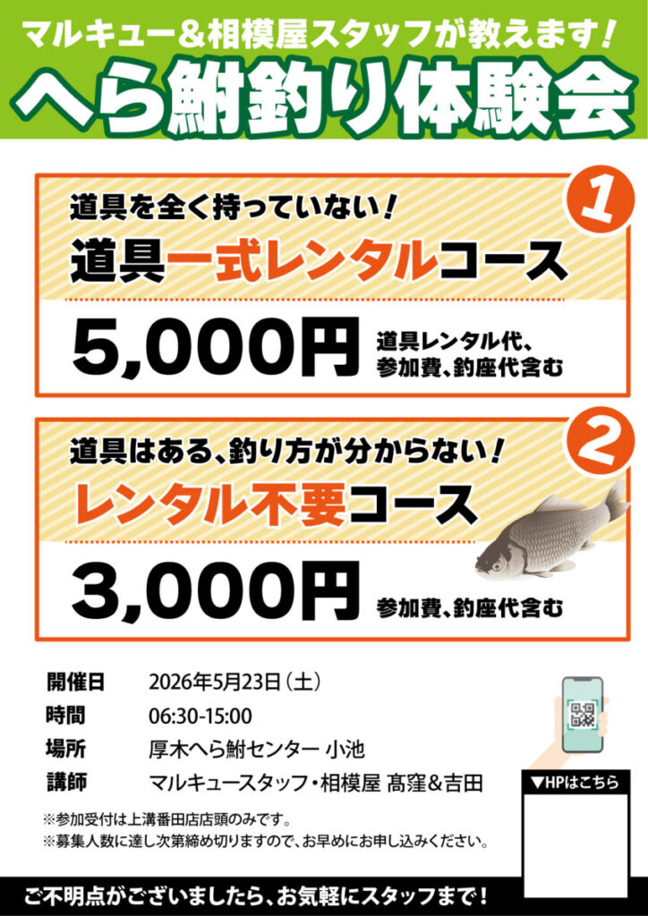 2026年5月23日(土)2026年相模屋へら鮒釣り体験会
