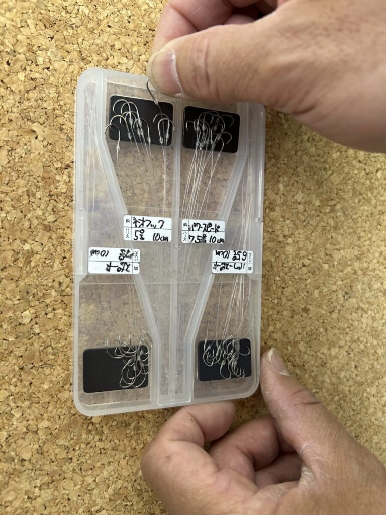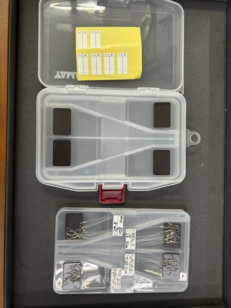 カワハギ針ケースに10cmハリス対応の商品がヤマワ産業さんから発売されました。8種類の針を収納可能で10cmハリスにも対応してるので私は10cmハリス専用で使うつもりです。メインは7cmハリスを使っていて釣り開始時に大体その日に使う数はマグネット板に一度に出していますが、状況に応じて使いたいと思う針は使う時に袋から出していますが少し面倒です。(まぁいいかぁって出さなくなってしまいますし)一袋づつ位をケースに収納しておいて直ぐに試せるように出来るのは便利かな?と思ってます。