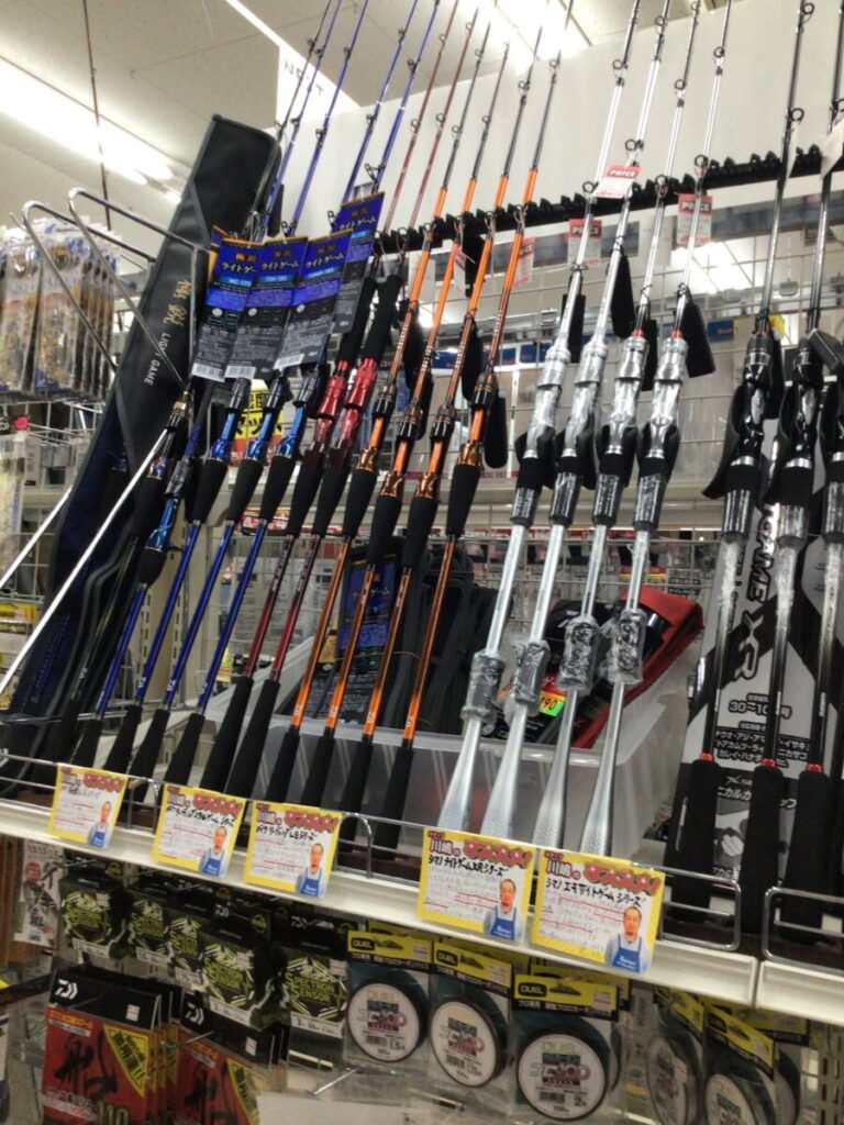 船釣りコーナー担当していて、ロッドを諸般の事情により、気軽に見れない状況である事を心苦しく思っていました。少しではありますが、そんな状況を改善すべく、大したことはないのですが、出来る範囲でケースや袋から出しての展示を増やしています。今回はライトタックルのロッドを展示しました。今後も増やしていければと思っていますので、お気軽にお手に取ってご覧下さい。オモリを下げれます。また、展示しきれないロッドもあります。ご覧になりたいロッドがございましたら、今まで通り、お近くのスタッフもしくは、担当川嶋までお申し付け下さい。不明な点などもお尋ねください。